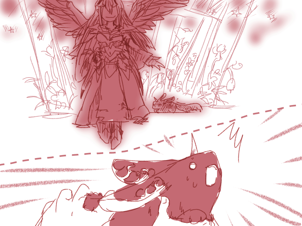 紅の魔王は目を細めて、花屋の城を去って行きました。ややあって、籠の中から、角の生えた黒いウサギのような動物が現れました。体や耳に白い蔦のような模様が渦巻いています。